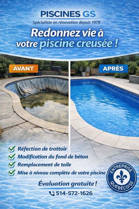 Pour une rénovation majeur voire complète de votre piscine creusée, Piscines GS peut vous offir ses services pour des changements de type "majeur" comme: